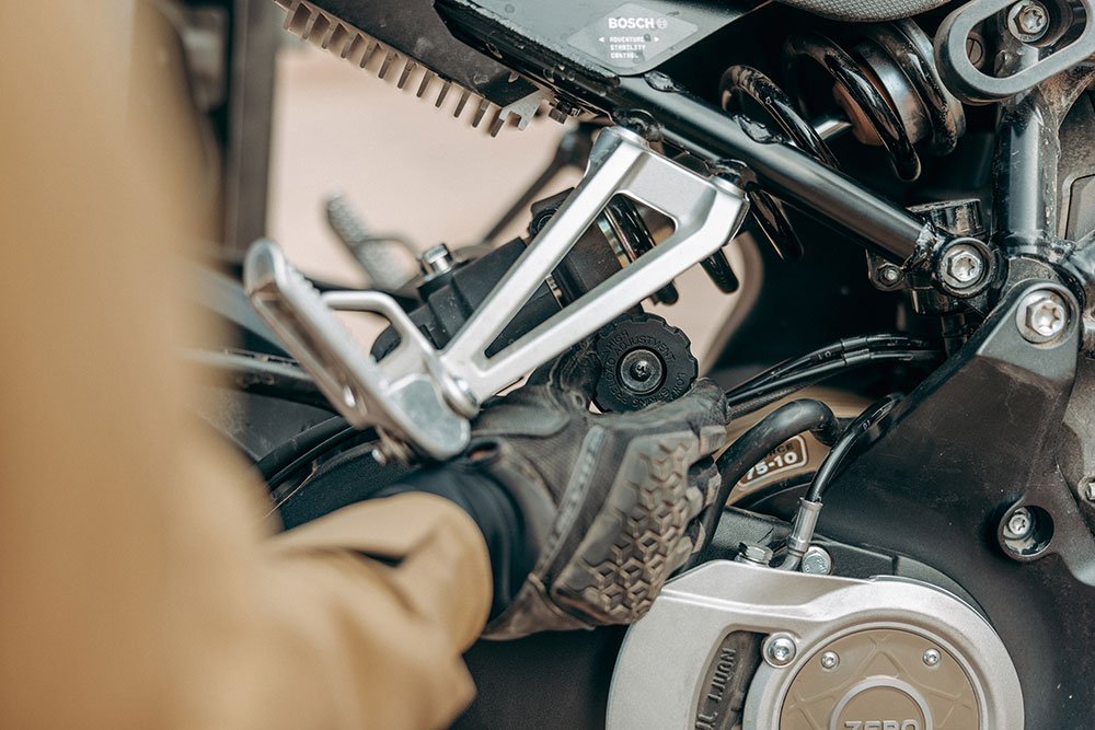 Uno de los apartados que reclamaban una mejora era el de la suspensión y Zero respondió a las críticas ofreciendo una nueva horquilla Showa de 47 mm con 7.4 pulgadas de recorrido y total capacidad de ajuste. No es exactamente la punta de lanza para el recorrido de la suspensión ADV, pero está casi media pulgada más cerca que antes. La DSR/X también recibió un nuevo amortiguador Showa totalmente ajustable que tiene un dial muy conveniente para ajustar la precarga. Útil si estás añadiendo un pasajero o llenando las maletas TRAX ADV opcionales.