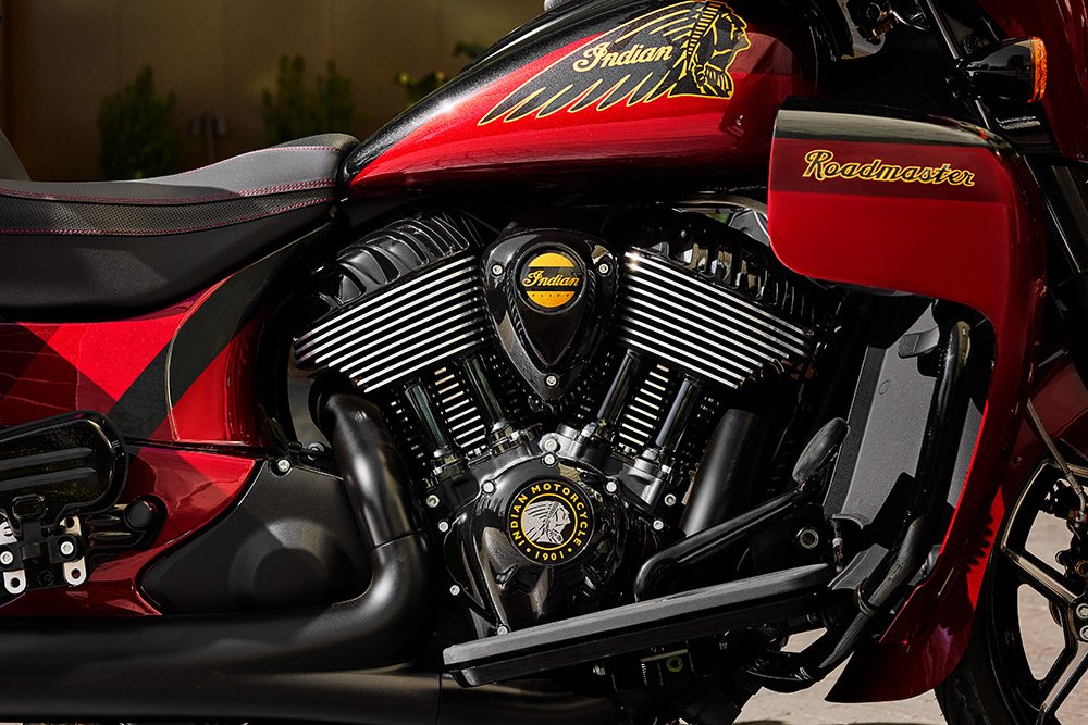 Luego está el proceso de pintura, que durante mucho tiempo ha sido un motivo de orgullo para las motocicletas Elite de Indian, que a menudo promocionan sus tonos aplicados a mano en casa. De hecho, la combinación de colores de la Roadmaster Elite es completamente nueva este año con pintura tritono Indian Motorcycle Red realizada con un acabado candy de primera calidad que rinde homenaje a la icónica pintura roja de la marca (vista por primera vez en 1904). En el pasado, Indian habría realizado ese trabajo de pintura en sus propias instalaciones de Spearfish, Dakota del Sur, pero esta vez la empresa se ha asociado con dos talleres de pintura personalizados muy conocidos: Gunslinger Custom Paint, en Colorado, y Custom Painted Vehicles, fuera de Wisconsin. Nos preguntamos si está sucediendo algo con Spearfish que debamos saber…