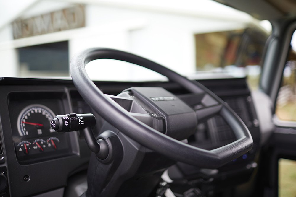 La cabina tiene un aspecto decididamente retro de “nariz de toro” gracias a la corta distancia de 103 pulgadas entre la defensa y la parte trasera de la cabina. Esto ofrece la ventaja de un radio de giro más corto y la capacidad de poner un poco más de peso en el eje delantero en aplicaciones de mayor carga útil. La visibilidad es sobresaliente hacia el frente y los lados, y las ventanas laterales recortadas ofrecen una vista muy cercana al lateral. Una mirilla opcional está disponible para la puerta del pasajero.