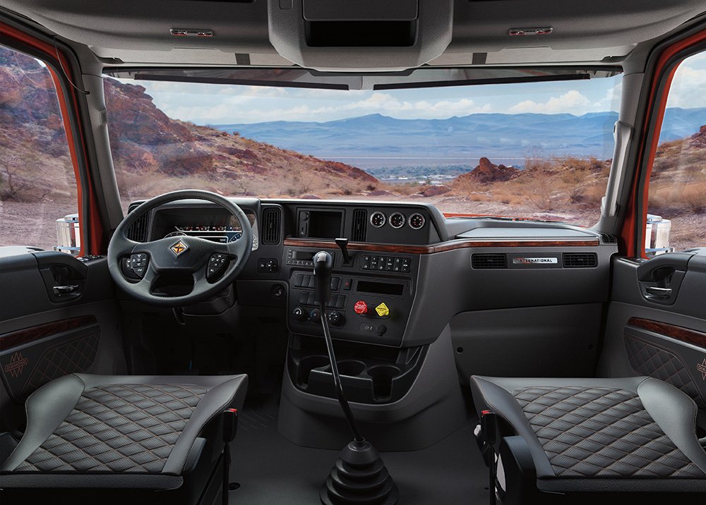 Uno de los cambios más evidentes en el interior es que la cabina es más grande, lo que brinda a los conductores más espacio para el abdomen y más espacio entre los pedales y la pared trasera. Las puertas se abren más para facilitar la entrada y la salida. Está equipado con lo que Navistar llama el “mejor sistema de calefacción y aire acondicionado en su clase”. Las ventanas eléctricas más grandes mejoran la visibilidad. La nueva cabina también está disponible con el paquete de equipamiento más nuevo y más alto de International Truck, Diamond Elite, que incluye una nueva línea de asientos premium con calefacción y ventilación.