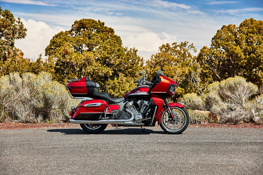 El otro aspecto destacado de la Pursuit orientado a la vida en carretera es lo que Indian llama un “baúl de carga premium” que parece aceptar dos cascos integrales y presumiblemente mucho más. Agrega las alforjas con bloqueo eléctrico y tendrás más de 35 galones de almacenamiento en el nuevo modelo. Otras características estándar en ambas Pursuit incluyen puños calefactables, un nuevo asiento Touring Comfort (el cual ofrece tres configuraciones de calor, que se pueden ajustar a través de la pantalla táctil) y reposa pies planos para el conductor y el pasajero.