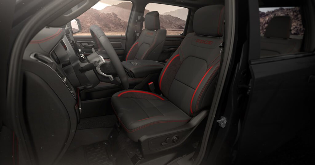 Como alivio de todo el material digital, la RHO tiene interruptores auxiliares físicos debajo de la pantalla táctil central, además de los botones digitales disponibles en otras Ram 1500. Los botones HVAC redundantes se alinean en el costado de la pantalla. El sistema de audio Harman Kardon de 900 vatios tiene 19 bocinas, solo superado por el sistema de 23 parlantes y 1200 vatios que se encuentra en el modelo Tungsten. El interior se completa con una insignia serializada en la consola central con especificaciones y un gráfico de rinoceronte, el espíritu animal no oficial de la RHO y un recordatorio constante de que la TRX está oficialmente extinta.
