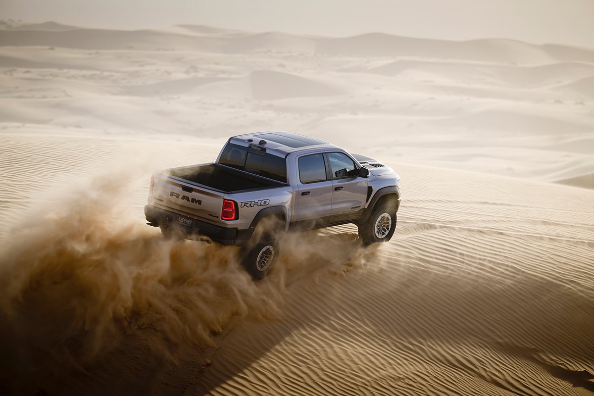 Pero la RHO fue diseñada para ensuciarse, así que pasemos al modo Baja. Normalmente, la distribución del par todoterreno entre los ejes delantero y trasero se divide uniformemente. En Baja, el 75 por ciento del torque disponible se envía a la parte trasera, lo que hace que la dirección del acelerador sea mejor en superficies sueltas y, francamente, más divertida. No es que no puedas hacer donas y lanzar enormes colas de gallo de arena en camionetas con tracción en las cuatro ruedas 50/50, pero es exponencialmente más divertido con más empuje en la parte trasera. ¿Es esta otra mejora con respecto al TRX? Eso depende de qué tan apegado estabas a esos dos cilindros adicionales.