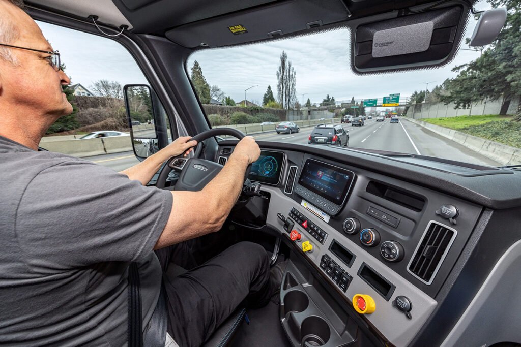 La cabina del eCascadia incluye un tablero envolvente ergonómico y moderno, con una pantalla digital LCD de dos monitores que brinda al conductor acceso personalizable a la información del estado del vehículo en la pantalla del panel A y una pantalla del panel B de información y entretenimiento con conexiones multimedia. Las características comprobadas en el Cascadia se trasladaron a la versión eléctrica, como los controles multifunción en el volante que permiten a los conductores aceptar, rechazar y finalizar llamadas telefónicas sin quitar las manos del volante, cambiar los controles del grupo de instrumentos menús de la unidad, utilizar el control de crucero y controlar el volumen del estéreo. Una columna de dirección ajustable de liberación rápida viene con un rango completo de movimiento para la comodidad del conductor, un control de limpiaparabrisas integrado y un interruptor estándar montado en la columna derecha para cambiar, así como ajustar la intensidad de frenado regenerativo entre configuraciones bajas, medias y altas.