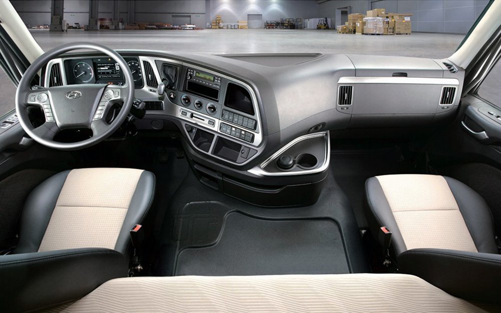 Lo primero que notas al subir al XCIENT es que la cabina es inusualmente alta. En Estados Unidos lo normal es que los camiones tengan el motor enfrente de la cabina, por lo cual la posición de la misma no es muy alta. Sin embargo, la cabina del XCIENT debe pasar por encima de toda la altura y la anchura del motor, por lo cual ponerse al volante del este camión se asemeja más a sentarse al timón de un barco de dos pisos que a un camión como lo conocemos.