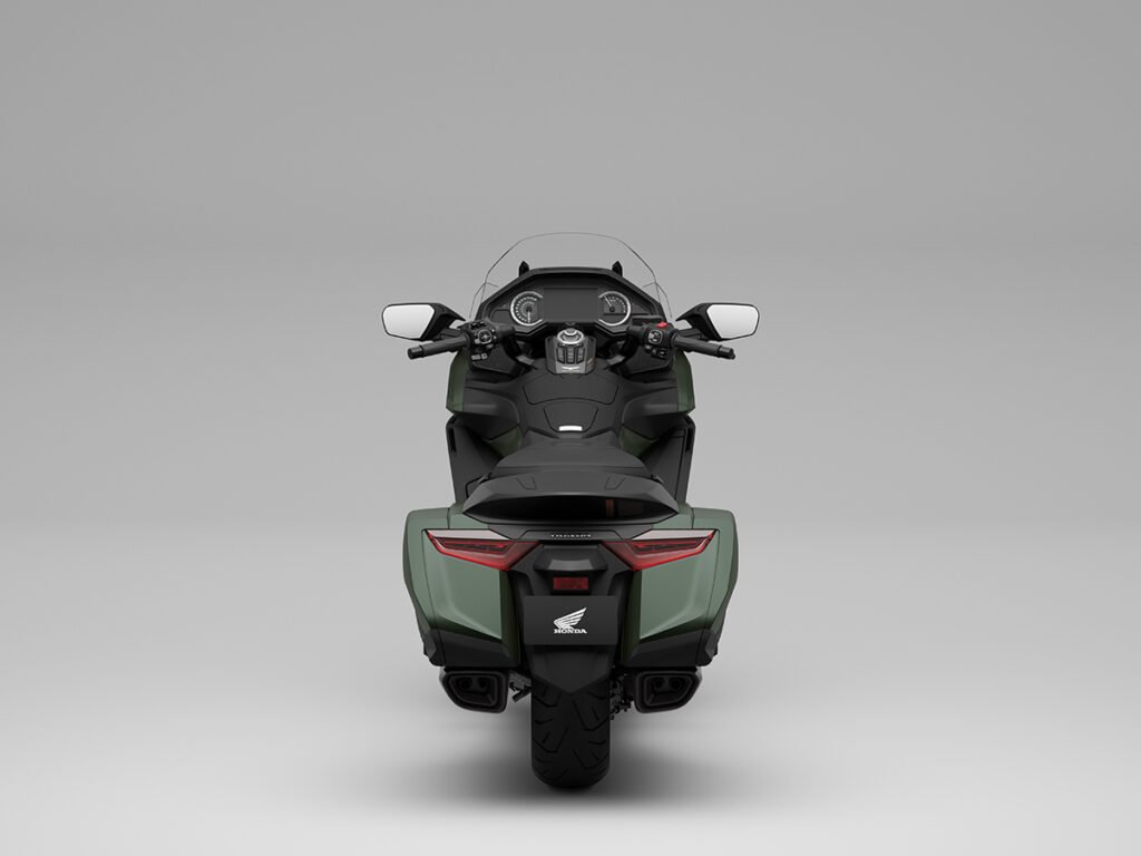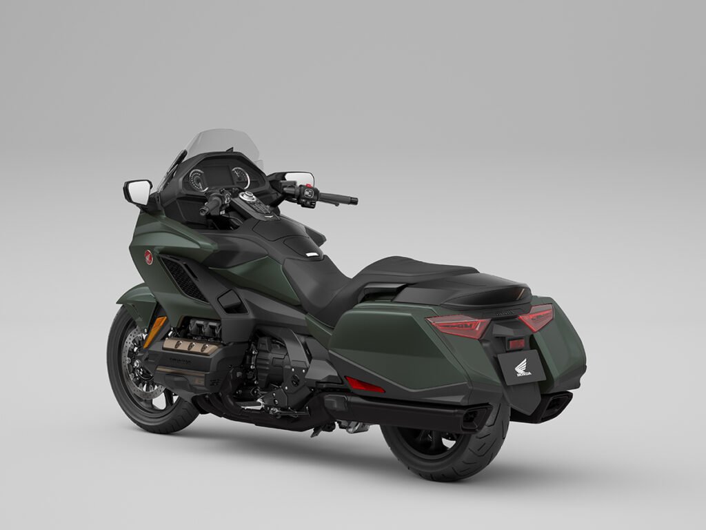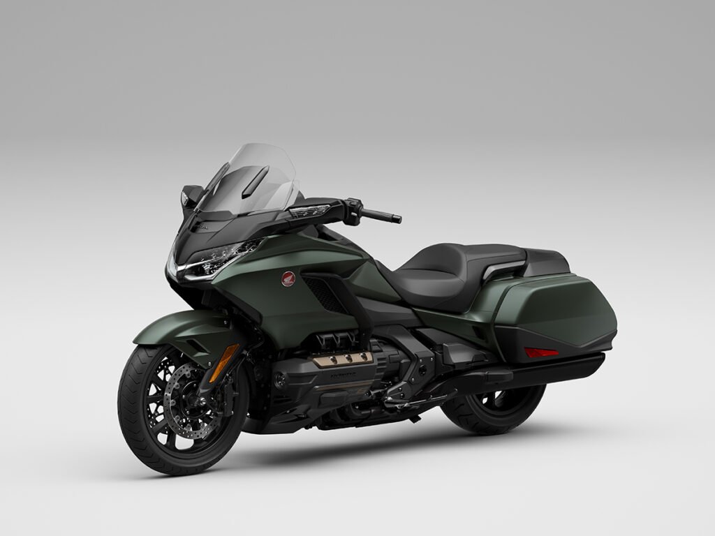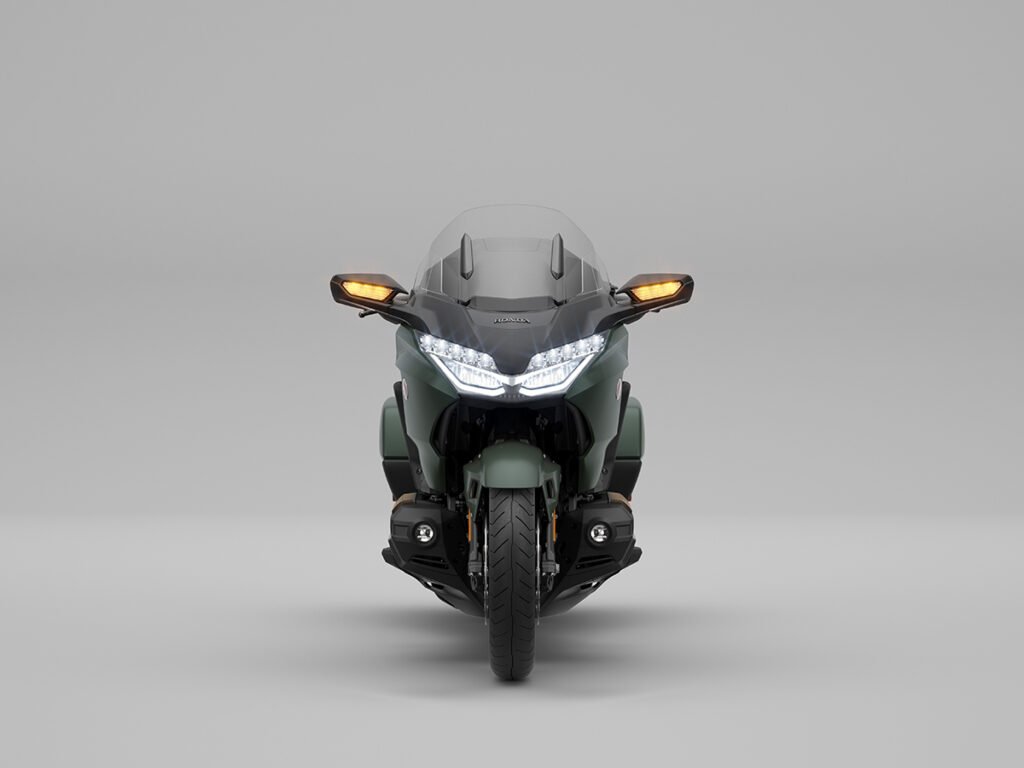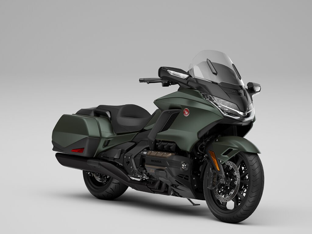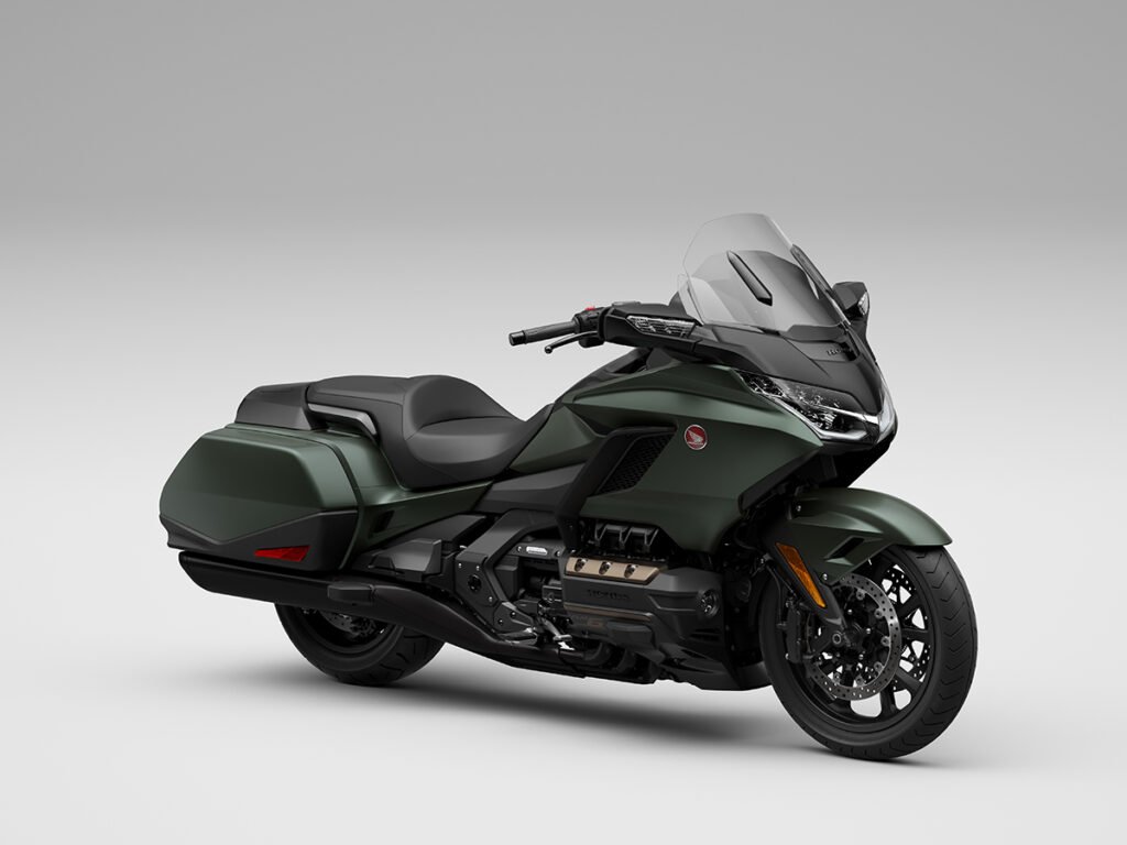 A diferencia de los modelos de entrada de la línea Gold Wing, los Bagger, los destinados al turismo están equipados con un parabrisas alto, maleta superior y un respaldo completo para el pasajero que hace que los viajes sean significativamente más cómodos. La salpicadera delantera está ventilada. ¿Qué queremos decir con esto? Que se desplaza entre miembros de suspensión inferiores algo en forma como de lámina que ayudan a dirigir la presión de aire entrante hacia el carenado frontal completo. Esto aumenta la penetración a pesar de la gran superficie que está empujando.