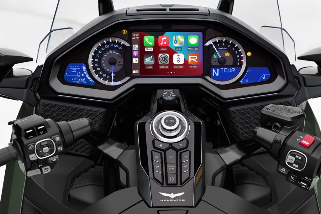 Honda llama al panel de instrumentos su Interfaz Hombre-Máquina, y puedes usarlo para acceder a las funciones de navegación, clima y música a travésde Apple CarPlay. Además, el sistema de infoentretenimiento se conecta vía Bluetooth con tu teléfono inteligente para recibir llamadas y mensajes sobre la marcha, por lo que no tendrás que estar fuera de alcance de nadie cuando vayas en tu moto. Claro que estar conectado suena un poco contraproducente si viajas para alejarte de todo, pero supongo que en gustos se rompen géneros. La fábrica incluso agregó un segundo puerto USB para ampliar las opciones de recarga / alimentación para tus diversos dispositivos móviles. El punto final de la interfaz hombre-máquina lo pone una fila de botones sobre el tanque de combustible de 5.55 galones.