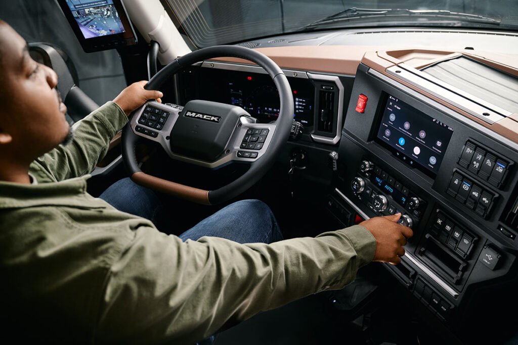 El volante, de 18 pulgadas, presenta un diseño de fondo plano que facilita el acceso y proporciona mayor espacio para las piernas. Los controles del volante son grandes y de fácil acceso, reflejando los atributos de la marca Mack. Además, la columna de dirección es ajustable en inclinación y telescópica, con una versión opcional que incluye ajuste de inclinación del cuello.