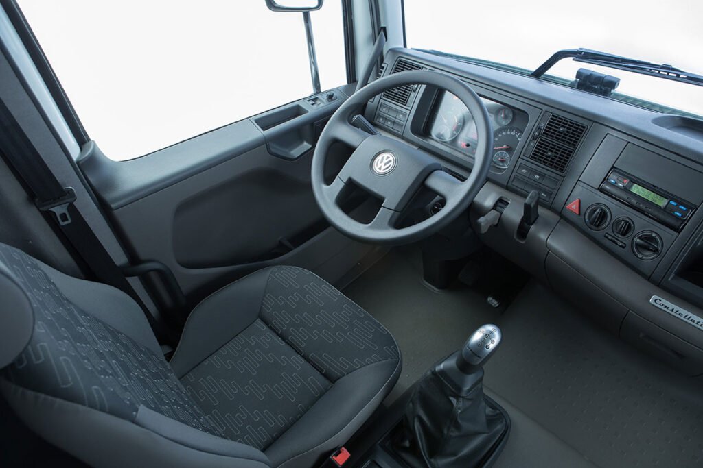 Al subir a la cabina del Constellation, lo primero que se percibe es que Volkswagen diseñó un entorno enfocado en el conductor. La ergonomía es protagonista desde el asiento, el cual cuenta con múltiples regulaciones, buen soporte lumbar y suspensión que reduce vibraciones. Esta característica es fundamental para los transportistas que pasan entre 8 y 14 horas al volante.