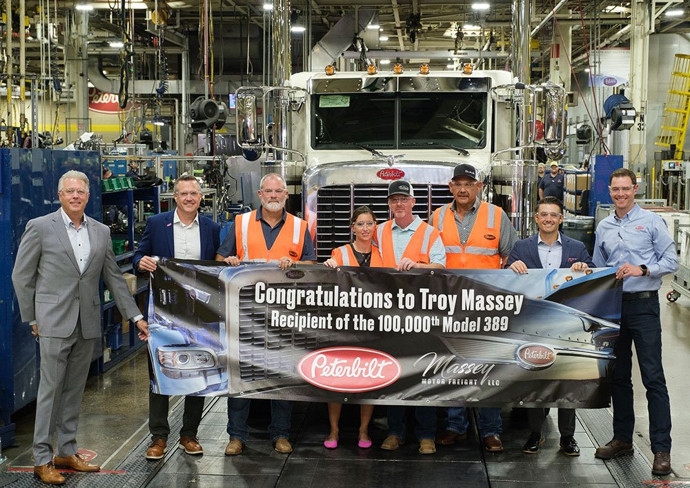 Troy Massey, propietario de Transportes Massey de Nacogdoches, Texas, estuvo presente a mediados de septiembre en la planta de fabricación de Peterbilt en Denton, Texas, para recibir el Peterbilt 389 número 100,000 fabricado en la planta. El hito se alcanzó en el que es el último año de producción del modelo. Peterbilt celebró el hito de producción el 7 de septiembre. El 389 se presentó en 2006 y este camión número 100,000 representa el arduo trabajo de diseñadores, ingenieros y empleados de la planta para crear y fabricar el camión más emblemático de las carreteras de América del Norte en la actualidad, dijo la compañía.