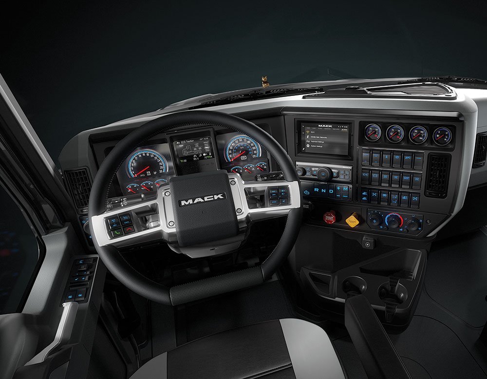 Los asientos son confortables y ajustables; al igual que la suspensión neumática que absorbe bastante bien las irregularidades del camino. El volante tiene un diseño de dos rayos con la base plana y algunas partes metálicas que lo hacen atractivo; además, es ajustable en altura y profundidad. Además, el Granite está equipado con el Sistema de Gestión y Control Vehicular de Mack (V-MAC IV), un sistema que te ayuda a monitorear en todo momento el estado del camión, el motor y cientos de parámetros programables. El V-MAC IV también incluye detector de fallas del ABS, protección integral de arranque, anulaciones programables a la luz de día, así como una grabadora del historial de viaje, información del ciclo de trabajo y de los intervalos de mantenimiento programados.